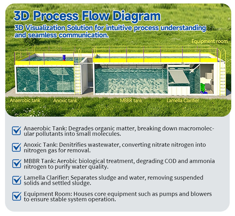 Tanque MBBR: Tratamento biológico aeróbio, degradando DQO e nitrogênio amoniacal para purificar a qualidade da água.